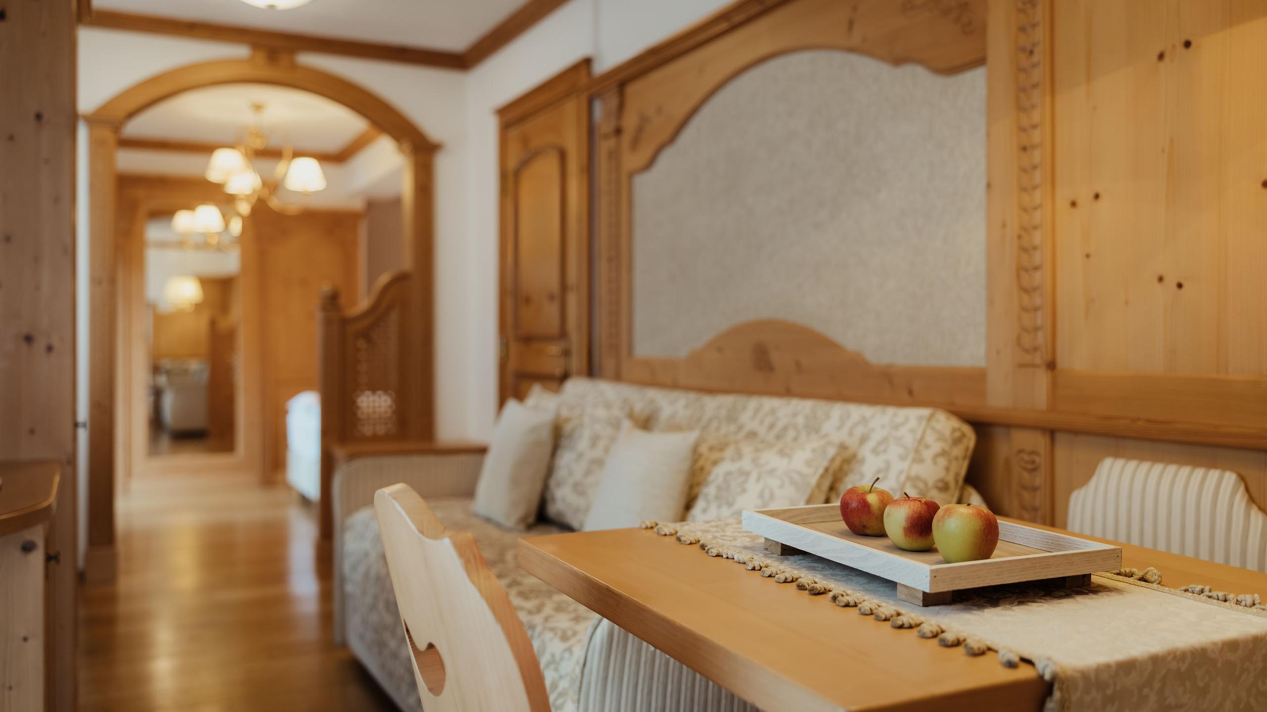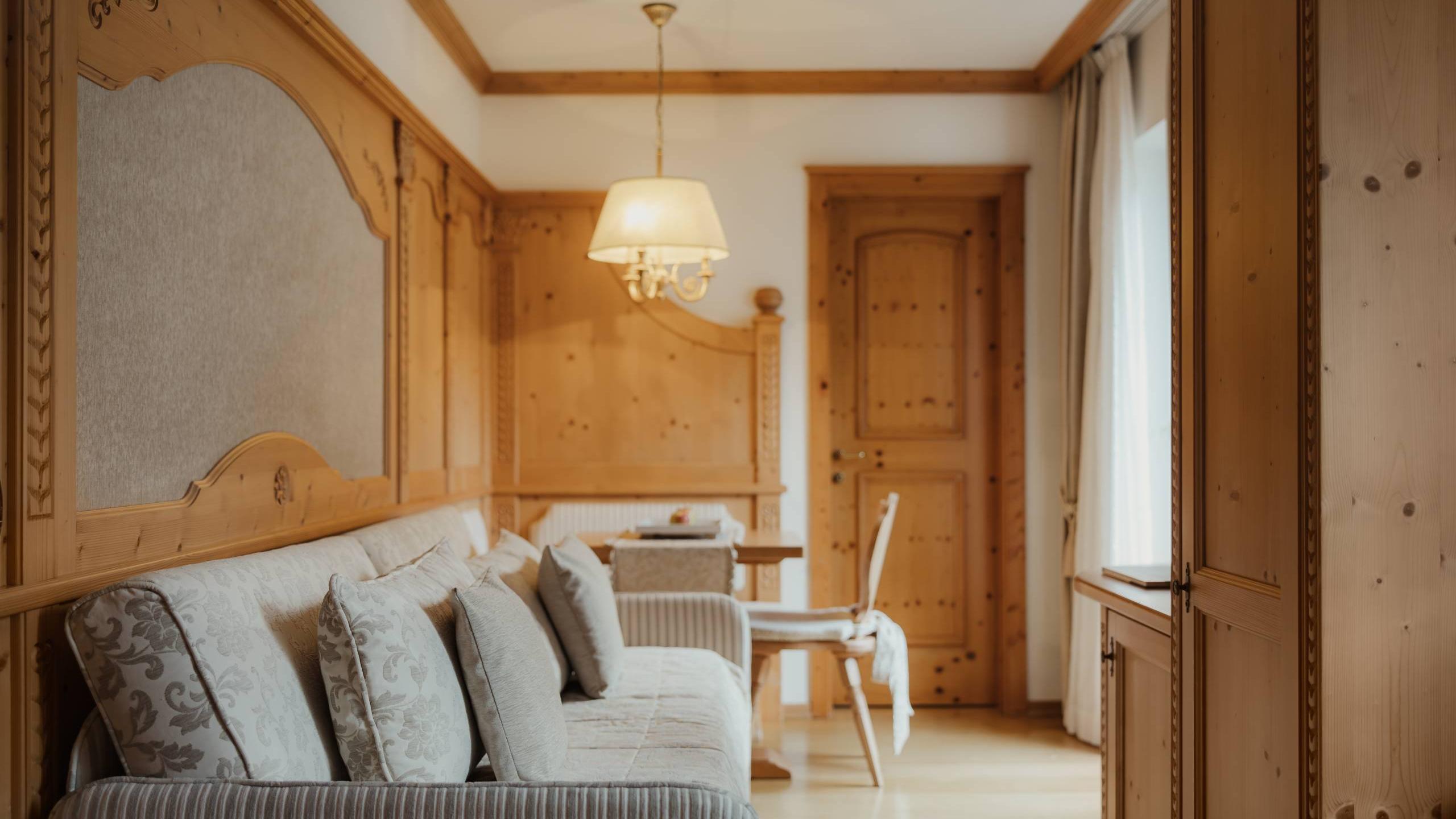 Legno pregiato, stoffe preziose e tonalità calde conferiscono a questa junior suite un fascino inconfondibile. Perfetta per chi desidera trascorrere un soggiorno deluxe in un’atmosfera di puro comfort. Dal lato nord godrete di un’incantevole vista sul Cimon della Pala, la seconda vetta più alta del Gruppo delle Pale di San Martino.